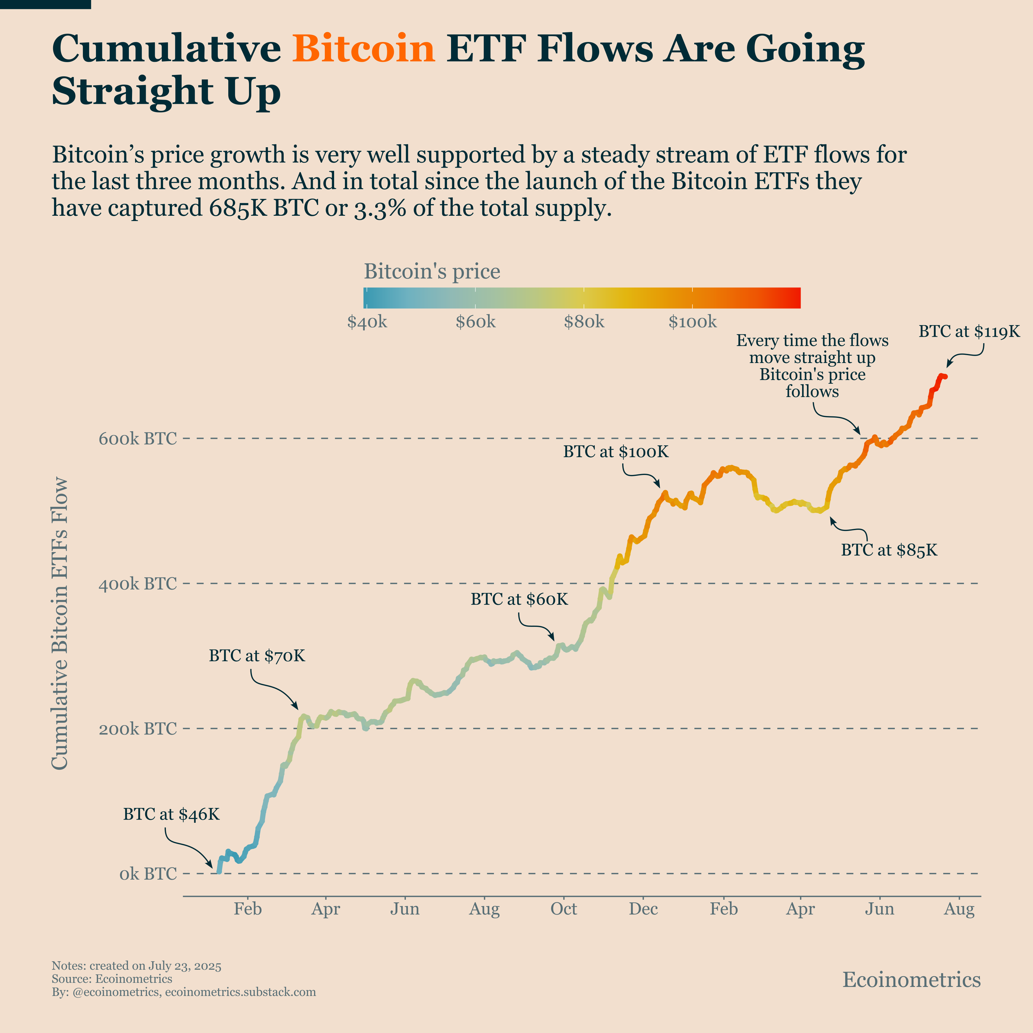 May 2025 to now: we’re in the middle of another sharp move up in ETF flows. Bitcoin has climbed from $85K to $119K.